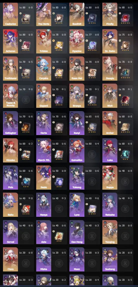 Honkai Star Rail | Europe TL70 | 23 legendary characters | 5 cones | Castorice + Cerydra | Tribbie + Acheron | The Herta + Boothill | Firefly + Rappa and more